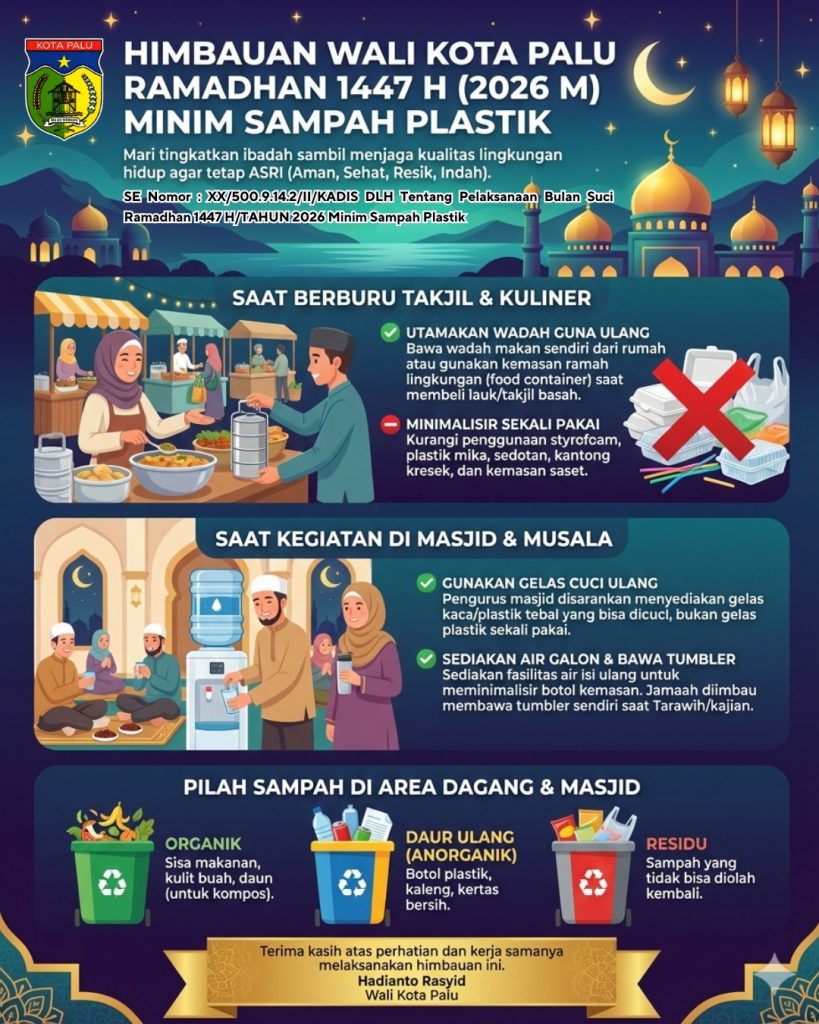 Wali Kota Palu Imbau Masyarakat Wujudkan Ramadhan 1447 H Minim Sampah Plastik Oleh IKP DiskominfoDipublikasi pada 02/03/2026Dipublikasi di Berita,Berita TerkiniTag: himbauan walikota,kota palu,minim sampah plastik,Pemerintah Kota Palu Post Views: 22 Navigasi pos Pemkot Palu Buka Program Magang Guru ke Malaysia, Tingkatkan Kompetensi GlobalWali Kota Palu Buka Audisi Tilawah Al-Qur’an 2026, Cari Bibit Qori-Qoriah Muda